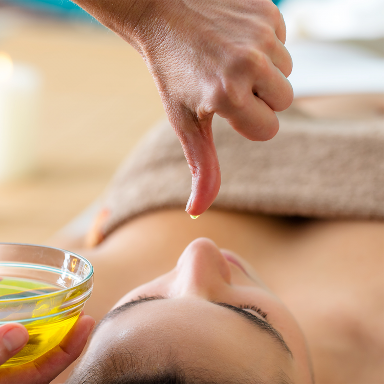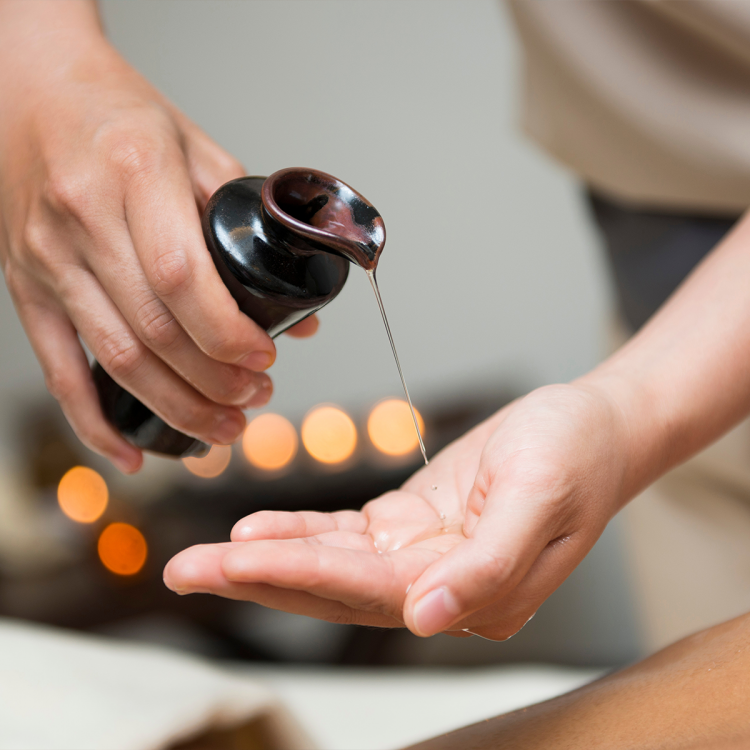 เป็นวิธีที่นิยมมากสำหรับน้ำมันหอมระเหย โดยเราจะเลือกให้เหมาะสมกับสภาพและอารมณ์ของทุกท่าน ผสมกับน้ำมันอื่น เช่น น้ำมันอัลมอนด์ หรือน้ำมันเมล็ดองุ่น ปริมาณน้ำมันหอมระเหยที่ใช้อยู่ระหว่าง 1-3 % ขึ้นอยู่กับชนิดของอาการ แต่ต้องให้แน่ใจว่าน้ำมันได้ถูกดูดซึมผ่านผิวหนังและเข้าสู่กระแสโลหิต โดยหลักทั่ว ๆ ไป โรคปวดในข้อ หรืออาหารไม่ย่อย ต้องใช้ความเข้มข้นมากกว่าโรคที่เกิ่ยวกับอารมณ์ประสาท การนวดด้วยตนเองต้องนวดเป็นจุดไป โดยเฉพาะ เท้า มือ และส่วนต่างๆ ของร่างกายที่ทำให้ไม่สบาย เช่น นวดท้องตามเข็มนาฬิกาด้วยน้ำมันสะระแหน่ที่เจือจางแล้ว เพื่อช่วยระบบย่อยอาหาร
